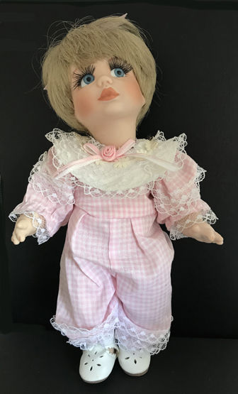 handmade porcelain doll with blue glass eyes, extended eyelashes, moveable arms, legs and head,